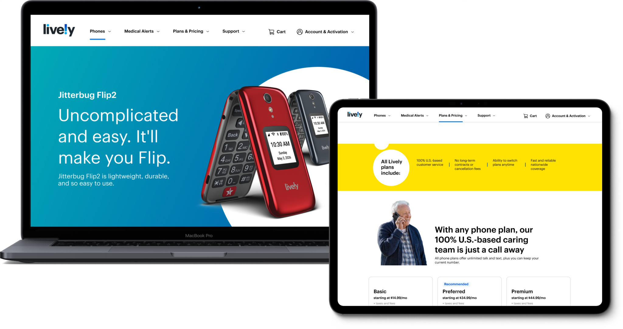 Sample designs for Lively.com browse and plan pages. Foundations and components were translated to support a range of needs from core design elements to more visually expressive, marketing-driven parts of the site.