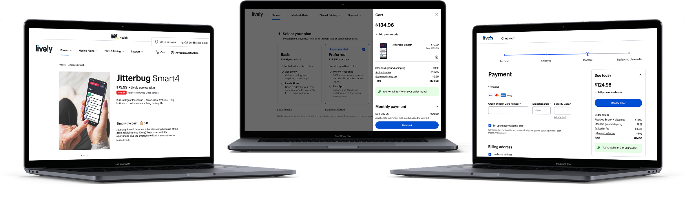 Screens from the Lively shopping journey, from plan selection through checkout. The mini cart (center) served as the actual BRIX pilot, validating design and code integration and paving the way to scale BRIX components across checkout and later other Livey and Best Buy Health experiences.