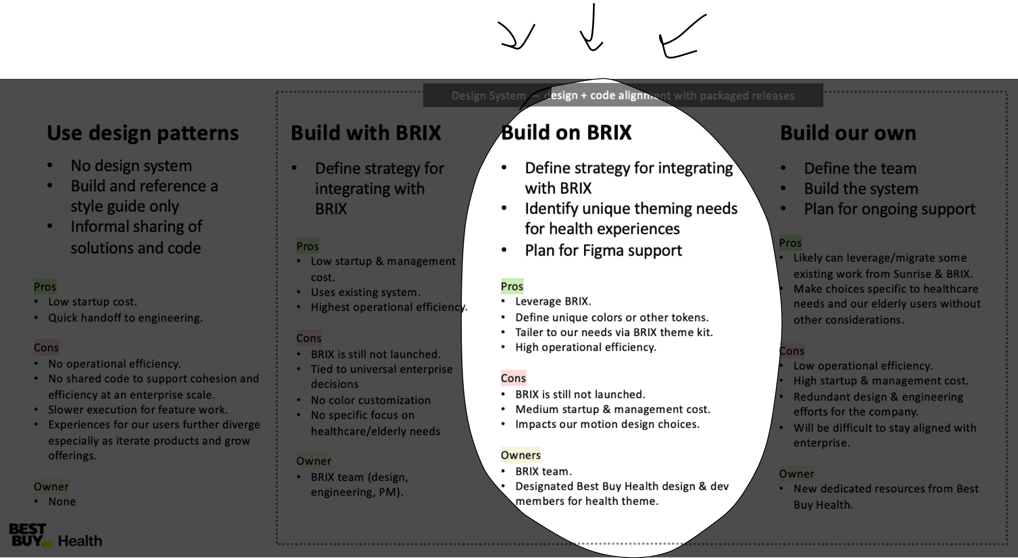 his phase spanned more than two years of iterative product design. The work remained influenced by Sunrise but evolved toward Best Buy Health’s brand by leveraging BRIX’s evolving direction and adding Health-specific overrides where needed. The bridge library and workflow strategy proved to be the ideal way to set the stage for full BRIX adoption.